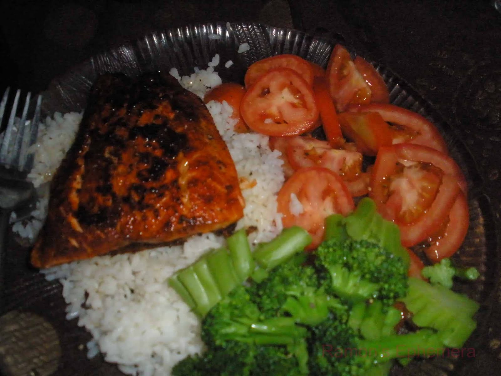 Salmon, tomatoes, broccoli and rice.